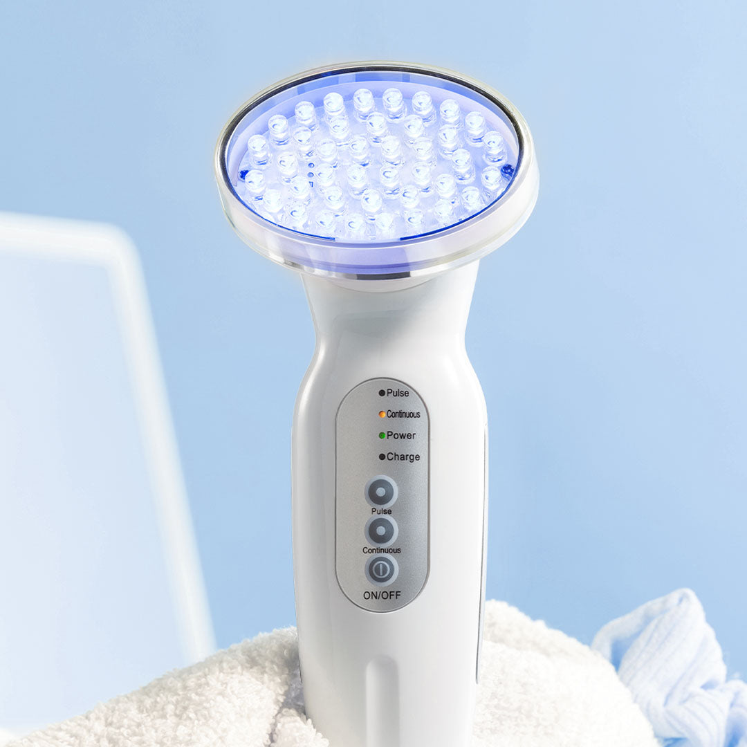 Pulsed + continuous mode blue light therapy device with 40 powerful LEDs designed to clear acne and target blemishes