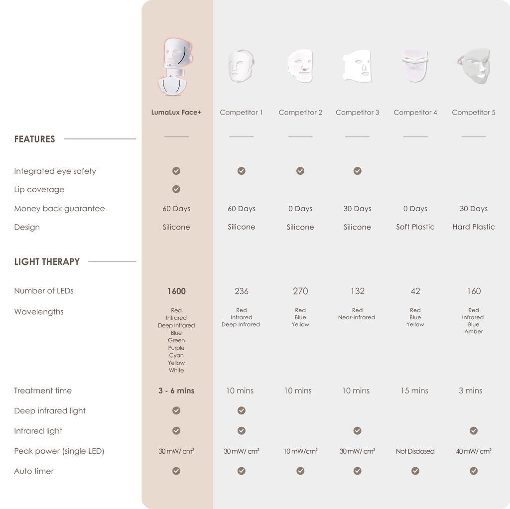 A: The LumaLux collection was born out of a desire to create the most powerful LED light therapy mask for at-home use with a simple and comfortable design. LumaLux uses professional-grade LED light therapy bulbs to deliver 30mW of power in just quick 3-6 minute sessions. We developed the concept by focusing on optimal light delivery, wavelength precision, and comprehensive coverage. We noticed that most brands average 66 bulbs on silicone masks - but this leaves much of the face untreated. LumaLux Face has 1600 densely packed LEDs. across the face and neck devices. You wouldn't apply your skincare to only part of your face, the concept for LED light delivery is the same