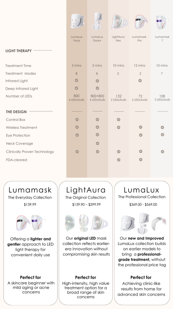 Firstly, look for a quality LED face mask from a reputable brand. Then examine your skin goals and choose a mask that treats your specific skin concerns. Check out our color reference guide above, and if you're looking for a more comprehensive treatment option choose a mask with several LED colors such as the Lumamask 7